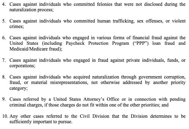 On their face, many of the priorities are reasonable. After all, numbers 2, 4, and 8 are explicitly what the denaturalization statute was created to address. But priorities 1, 3, 5, 6, 7, 9 are written intentionally broadly, such that they are likely to bring many referrals that are not actually legal grounds for denaturalization.